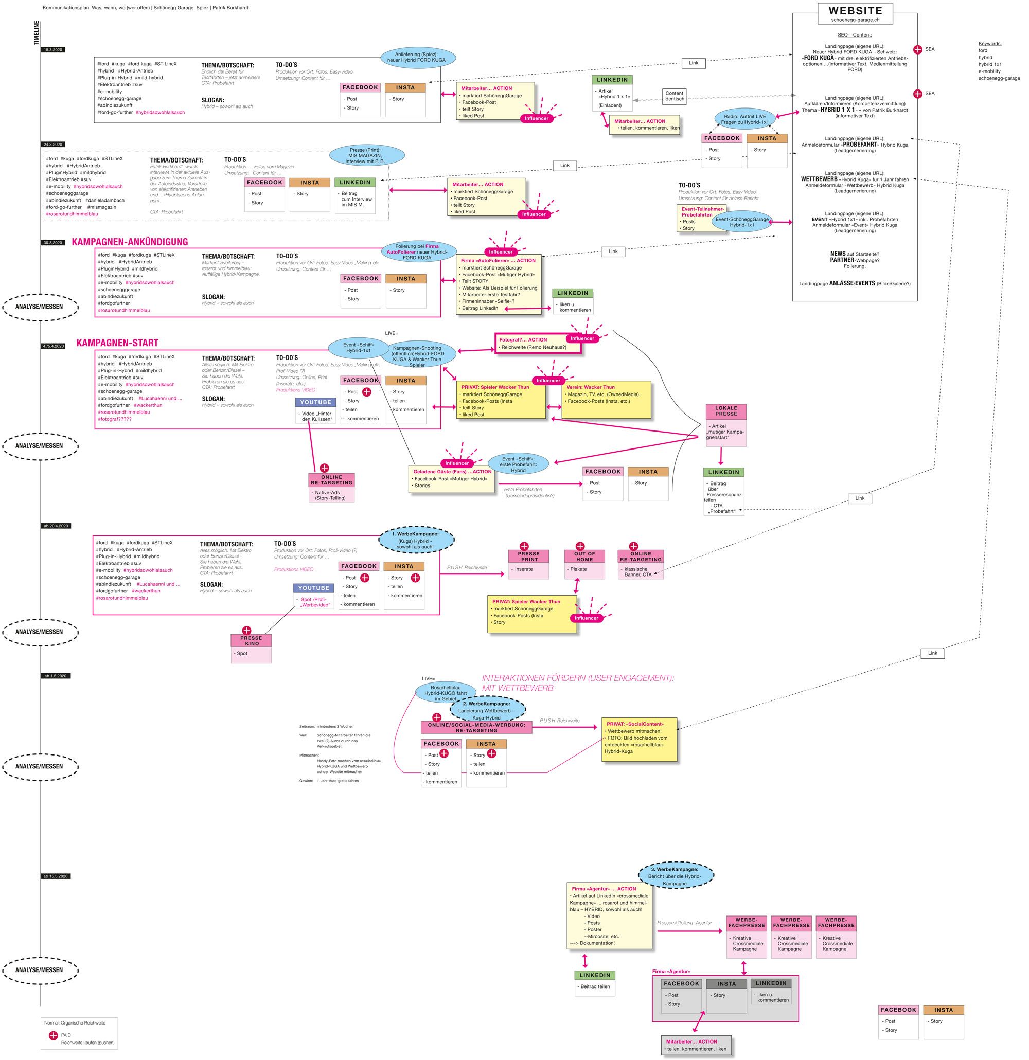Die Map der crossmedialen Kampagne für die Schönegg Garage verdeutlicht die Vernetzung, das Orchestrieren, der verschiedenen Meilensteine, Aktionen (blau), wie z. B. die Auto-Folierung und die «Reaktionen», die ausgelöst wurden in Form von Dokumentationen (Foto/Video/Text) und Kommunikation auf den Social-Media-Plattformen, der Website und auch Print wie PR oder Plakate. «Dominostein-Effekt-mässig» löst ein Meilenstein eine Aktion aus und diese wiederum eine Redaktion. Ziel war immer das Herzstück, nämlich die sehr informative, extra konzipierte Microsite «hybrid-ford-spiez.ch». Die «Story», die Leitidee wird nie aus den Augen verloren: Hybrid – mal so, mal so.