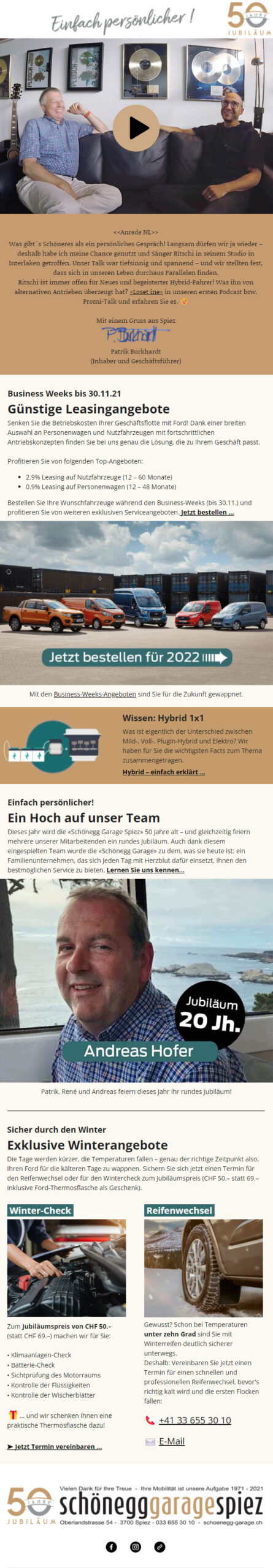 Einerseits sollte die Crossmedia-Kampagne aufklären (Was bedeutet «Hybrid» eigentlich?) und andererseits sollte sich die «Schönegg Garage Spiez» mit der Marke Ford als zukünftiger kompetenter Ansprechpartner zum Thema «Hybrid» positionieren. Die Aufklärungs- und Bekanntheitskampagne wurde auf Basis einer kreativen Leitidee entwickelt und crossmedial in der Region ausspielt: auf Social-Media-Kanälen (Facebook, Instagram, LinkedIn), auf Plakaten, in Magazinen und Zeitungen (Inserate), per Radio-Spot – und natürlich «per Auto».