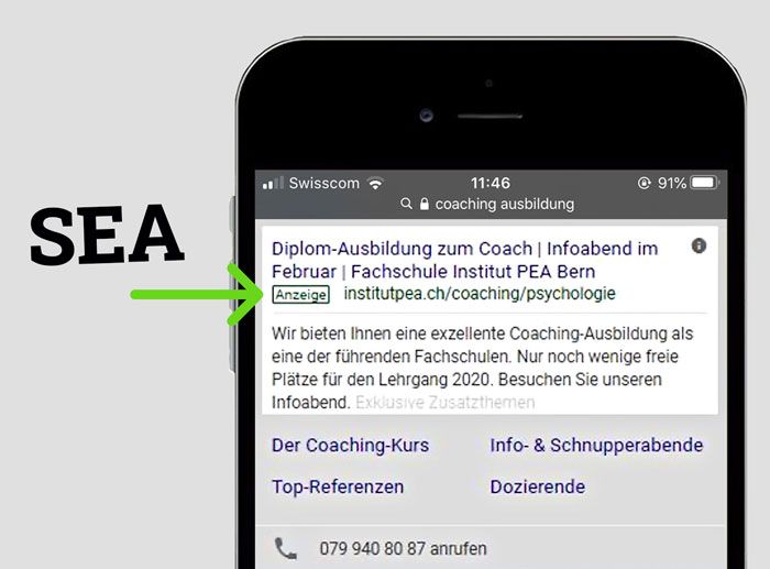 Google-Suchanfragen: User wollen grundsätzlich nicht suchen, sondern finden! Mit den vorab analysierten Keywords, zum Beispiel «coaching ausbildung», haben wir erfolgreich Google Ads (SEA) für das «Institut PEA» in Bern geschaltet: 23’817 Einblendungen, 1’207 Klicks, CTR 5.06 %. Dank unserer Online-Kampagne waren alle Plätze für den exklusiven Diplom-Kurs «PEA Coaching & Psychologie» bereits Mitte Februar belegt.