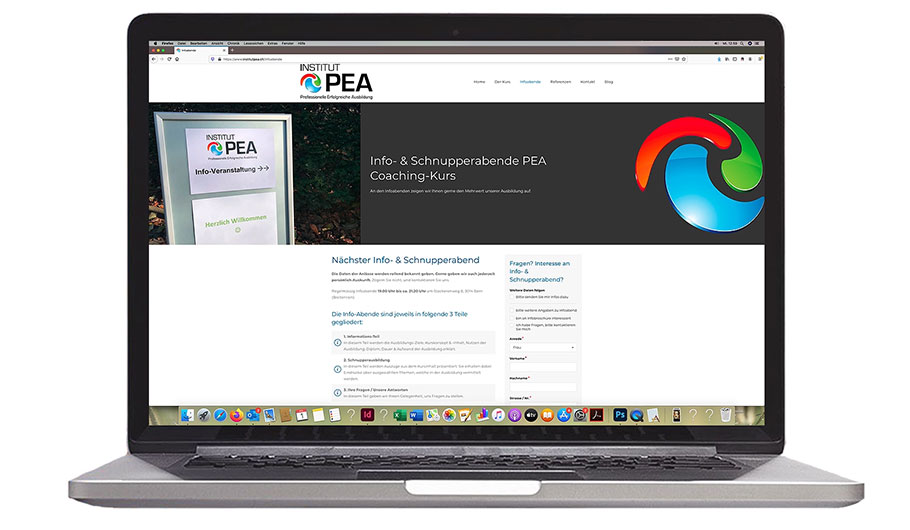 Für die Infoabende zum exklusiven Diplom-Kurs «PEA Coaching & Psychologie» wollte die Fachschule «Institut PEA» in Bern möglichst viele Anmeldungen über die eigene Website generieren. Dafür optimierten wir ihre bestehende Corporate Website mit einer neuen, übersichtlichen Navigationsstruktur und modernerem sowie responsivem Webdesign, um die User Experience deutlich zu verbessern. Im Zentrum stand dabei eine schnellladende Landingpage mit benutzungsfreundlichem Anmeldeformular, die als Grundlage für ihre Online-Kampagne diente.