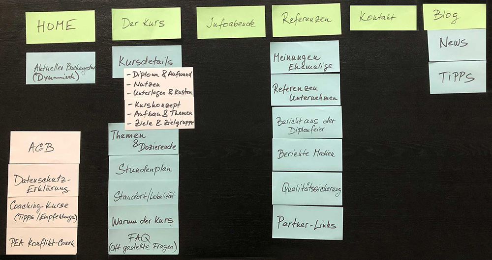 Damit eine bestehende Website besser strukturiert werden kann, sollten vorab stets die Prioritären festgelegt werden – z. B. in einem Workshop. Einen Erstentwurf der Navigationsstruktur haben wir zusammen mit dem Kunden mittels «Card Sorting» erstellt. Die bestehenden Website-Inhalte wurden neu zugeordnet – und bereinigt.